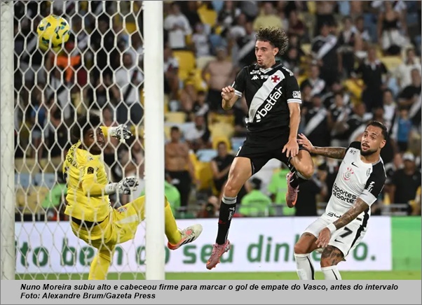 No Maracanã lotado, as duas equipes iniciaram o confronto decisivo com muita cautela e uma chance para cada lado. Aos Aos 18 minutos, Matheuzinho fez um ótimo lançamento para Yuri Alberto dominar com categoria dentro da área e bater por cima na saída do goleiro Léo jardim para abrir o placar para o Timão. Aos 25′, Yuri perdeu grande chance de marcar o segundo gol. José Martínez tentou de voleio e a bola foi em direção ao centroavante, que de frente para o gol finalizou alto, longe do travessão. Na sequência, o Vasco melhorou no jogo e teve seguidas oportunidades. Aos 30′, Thiago Mendes cabeceou para a defesa de Hugo Souza. Aos 35′, Rayan fez ótima jogada pela direita e cruzou na área, mas Coutinho chegou atrasado. Cinco miutos depois veio a jogada do gol de empate do Cruzmaltino. Andrés Gómez venceu a marcação de André Ramalho pela esquerda e cruzou para Nuno Moreira, que apareceu atrás da zaga para cabecear firme sem chance para Hugo Souza e deixar tudo igual no Maracanã.