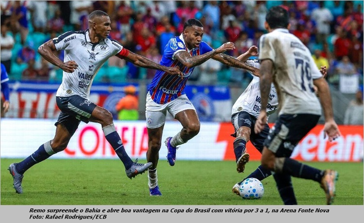 O Remo construiu ótima vantagem sobre o Bahia na disputa por vaga nas oitavas de final da Copa do Brasil 2026, com vitória por 3 a 1, nesta quarta-feira (22), na Arena Fonte Nova. Com o resultado, o Leão Azul poderá até perder por um gol de diferença no jogo da volta, no dia 13/05 (quarta-feira), às 21h30, no Mangueirão, em Belém (PA), que se classifica para a próxima fase da competição. O Tricolor de Aço precisa de uma vitória por três gols de diferença para avançar. Se vencer por dois gols, a decisão vai para os pênaltis.
