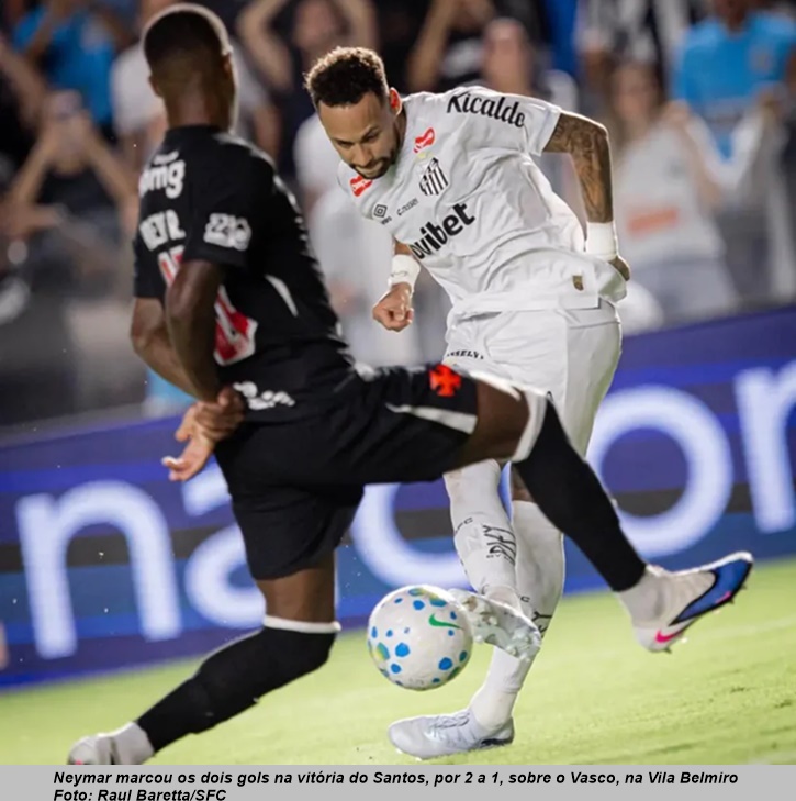 O Santos venceu o Vasco por 2 a 1, nesta quinta-feira (26), na Vila Belmiro, em confronto direto na zona do rebaixamento válido pela 4ª rodada do Campeonato Brasileiro 2026. Com o resultado, o Santos subiu para a 13ª posição na tabela, com 4 pontos. Um a mais que Botafogo e Vitória, adversários nesta rodada (4ª) em partida adiada, seguidos do Remo, primeiro fora da lista dos quatro últimos colocados composta no momento de: Atlético-MG, Internacional, Cruzeiro, todos com 2 pontos. E agora, o Vasco na lanterna com apenas 1 ponto ganho. O Peixe saiu na frente com gol marcado por Neymar. Pouco antes do intervalo, Barros empatou para o Cruzmaltino. No começo da etapa final, Neymar marcou seu segundo gol na partida e sacramentou a primeira vitória do Santos no Brasileirão 2026. Veja os gols.